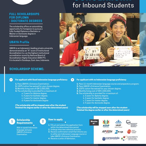 Following the successful implementation of the 1st UBAYA International Scholarship (UIS), the university is now offering the 2nd UIS for Diploma, Bachelor, Master, or Doctorate degree.