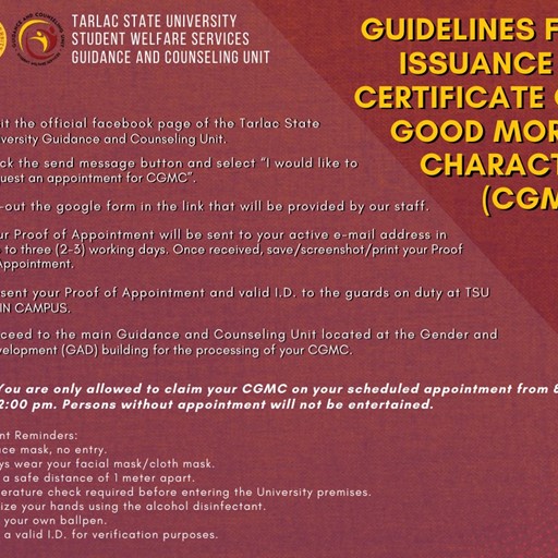 6. Proceed to the Guidance and Counseling Unit (TSU Main Campus) located at the Gender and Development (GAD) building for the processing of your CGMC.