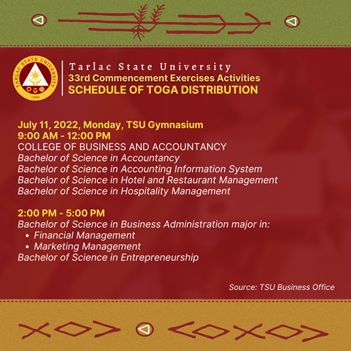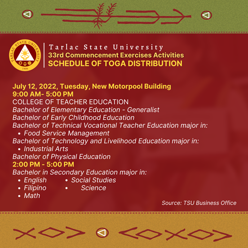 To all candidates for graduation in the 33rd Commencement Exercises in July 2022 (undergraduate programs), please see the following schedule of toga distribution from July 11 to July 15, 2022.
