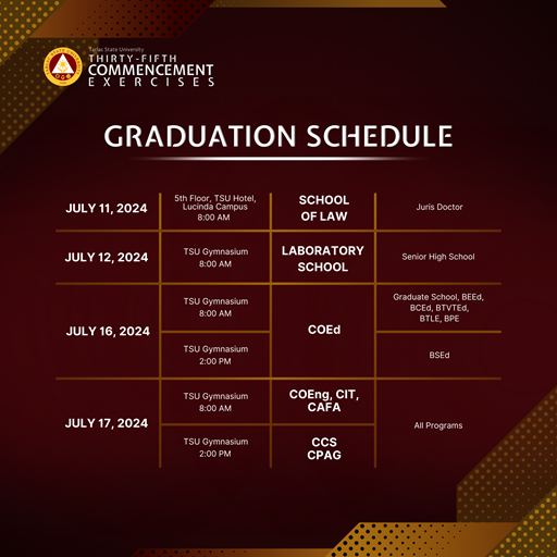 To all candidates for graduation, here are the graduation activities for the 35th Commencement Exercises that will be held this July 2024.