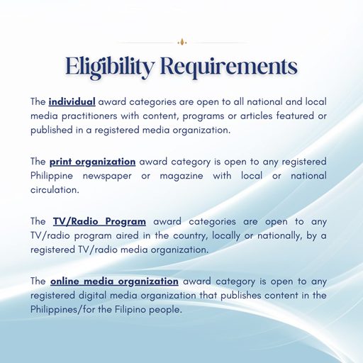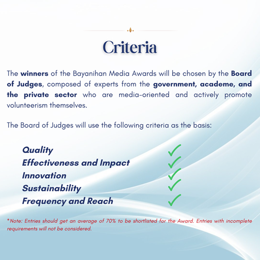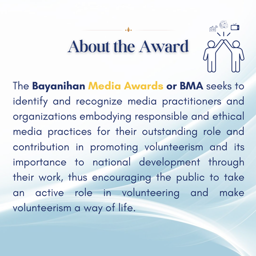 This award is a collaborative effort between the Philippine National Volunteer Service Coordinating Agency (PNVSCA), Philippine Information Agency (PIA), Philippine Association of State Universities and Colleges (PASUC), Department of Public Works and Highways (DPWH), and the Ayala Foundation Inc. (AFI), celebrating outstanding media practitioners and organizations that champion responsible and ethical media practices.
