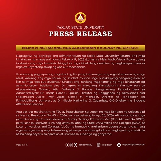The Tarlac State University administration initiated a dialogue among student representatives on February 17, 2025 (Monday), at the Main audio-visual room, concerning comments on payment deadlines for students covered by the opt-out mechanism.