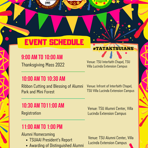 In line with the 116th foundation and 33rd charter anniversary of our beloved university, the Tarlac State University Alumni Association Inc. has prepared festive activities that the alumni will enjoy in-person and virtually!